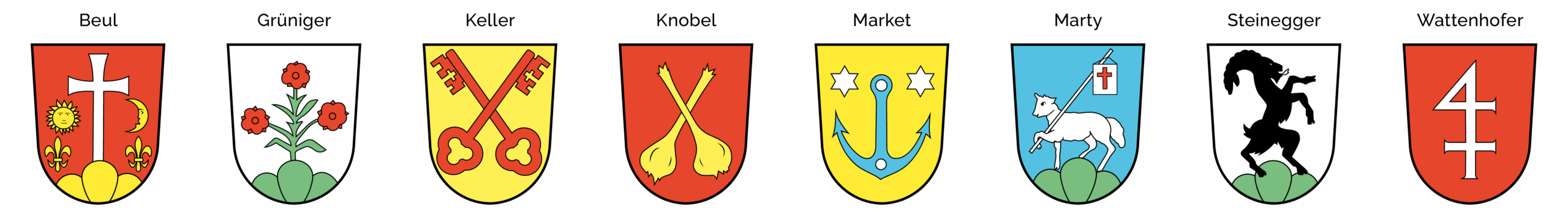 Ursprünglich waren acht Familiennamen (Beul, Grüniger, Keller, Knobel, Market, Marty, Steinegger, Wattenhofer) in der GSA registriert.
